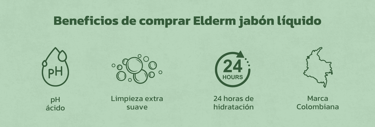 - Moje sus manos y accionando la válvula dispensadora aplique una cantidad suficiente de Elderm Jabón Líquido en las partes del cuerpo que requiera lavar, frote hasta obtener espuma y enjuague con abundante agua.