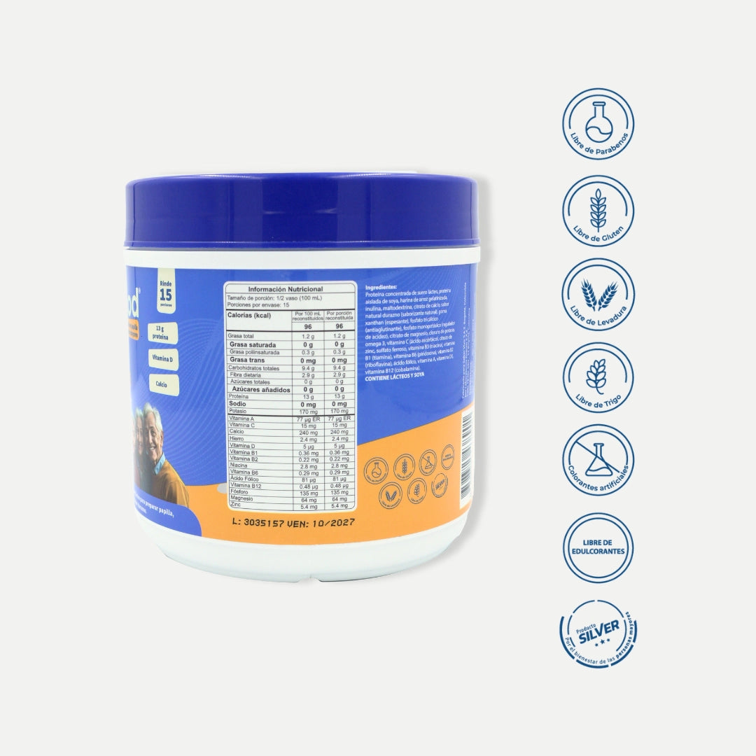 Proteína Concentrada de Suero Lácteo, Proteína Aislada de Soya, Harina de Arroz Gelatinizada, Inulina, Maltodextrina, Citrato de Calcio, Sabor Natural Durazno (Saborizante Natural), Goma Xanthan (Espesante), Fosfato Tricálcico (Antiaglutinante), Fosfato Monopotásico (Regulador de acidez), Citrato de Magnesio, Cloruro de Potasio, Omega 3, Vitamina C (Ácido ascórbico), Citrato de Zinc, Sulfato Ferroso, Vitamina B3 (Niacina), Vitamina B1 (Tiamina), Vitamina B6 (Piridoxina), Vitamina B2 (Riboflavina), Ácido Fólico, Vitamina A, Vitamina D3, Vitamina B12 (Cobalamina).