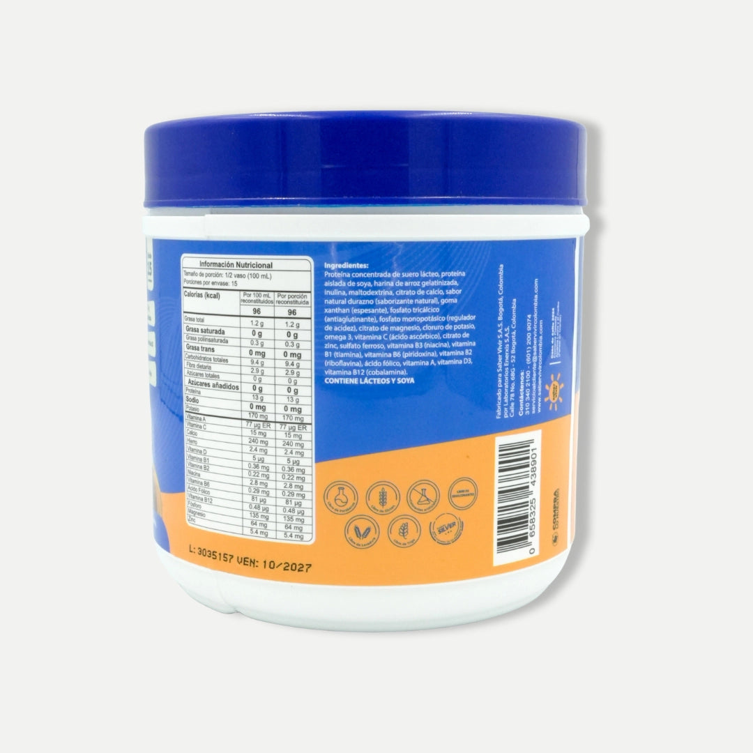 Alimento para preparar papilla, ideal para personas mayores, incluyendo a aquellas con dificultad en la deglución. Con proteínas de alto valor biológico y nutrientes clave. Sin azúcar ni sodio. Rinde para 15 porciones.