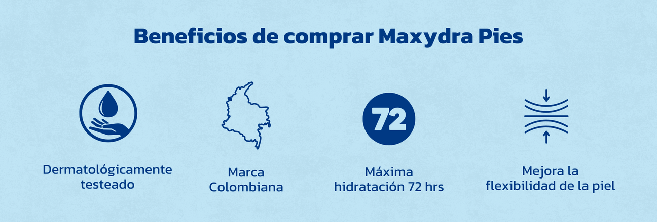 - Aplique diariamente, masajeando los pies, especialmente en aquellas zonas ásperas, resecas y rígidas que requiera hidratar, y repetir la aplicación las veces que sea necesario. El uso frecuente de MAXYDRA® PIES ayuda a mantener la piel suave, flexible e hidratada.